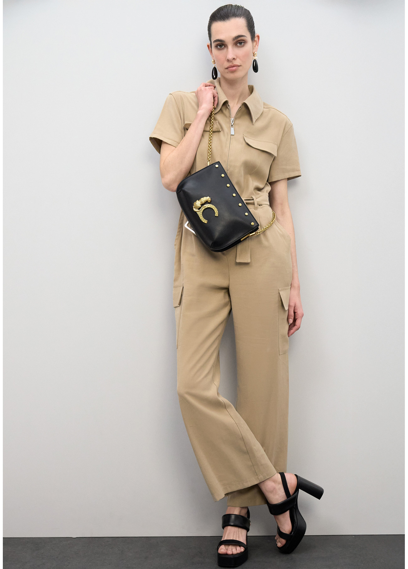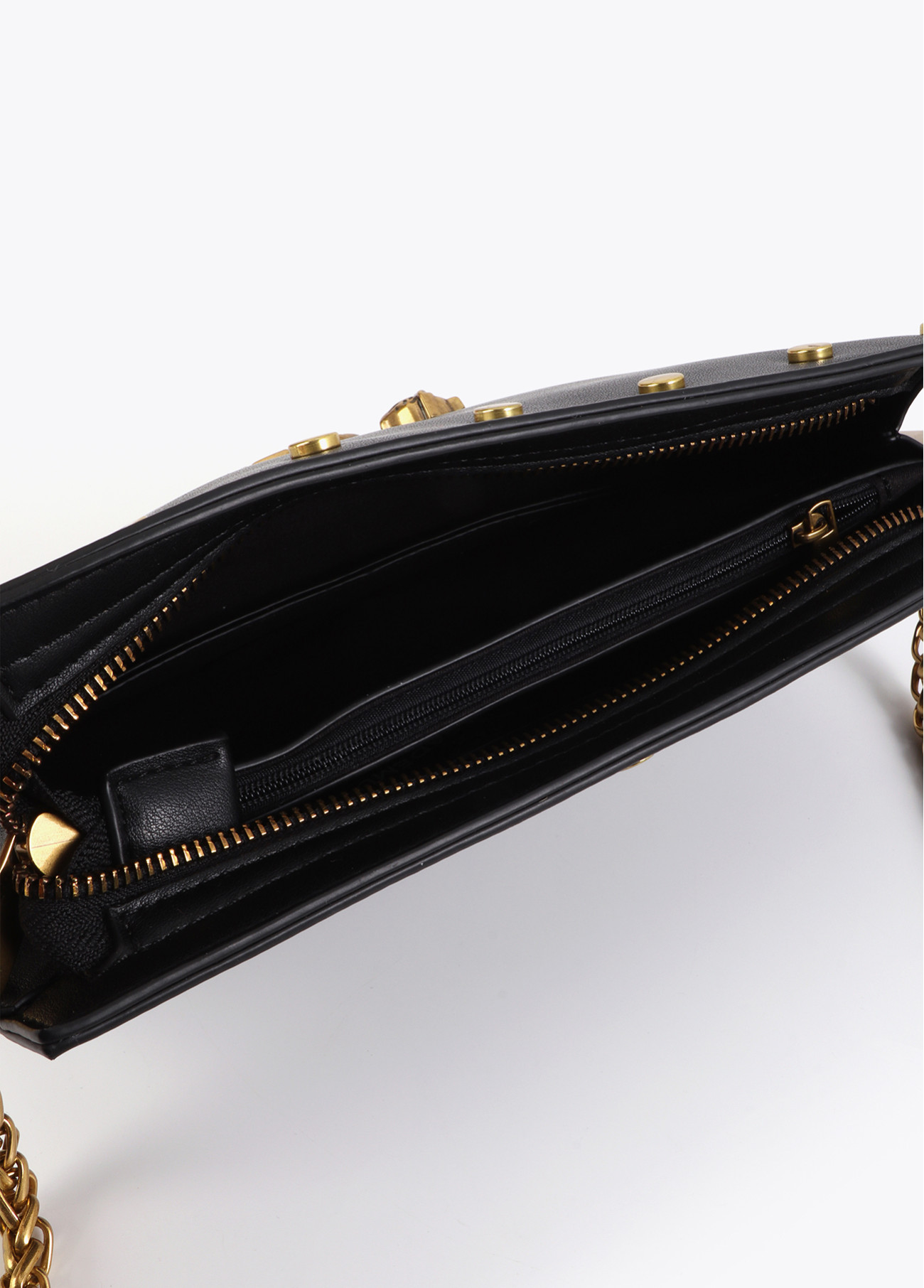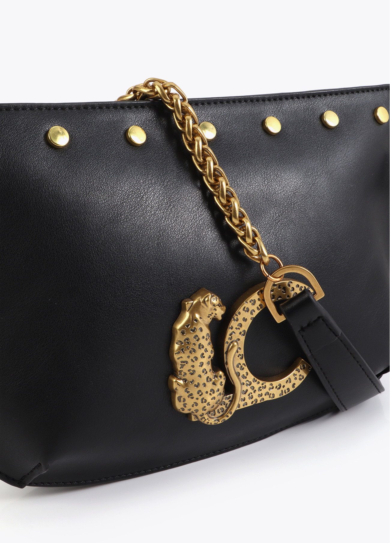 Bandolera elegante en piel sintética negra con logo dorado y detalles de tachas. Asa de cadena ajustable en dorado para un look sofisticado. Interior forrado con separadores para máxima organización. Un accesorio imprescindible para aportarle un toque chic y moderno a tu atuendo diario. Cierre de cremallera superior.