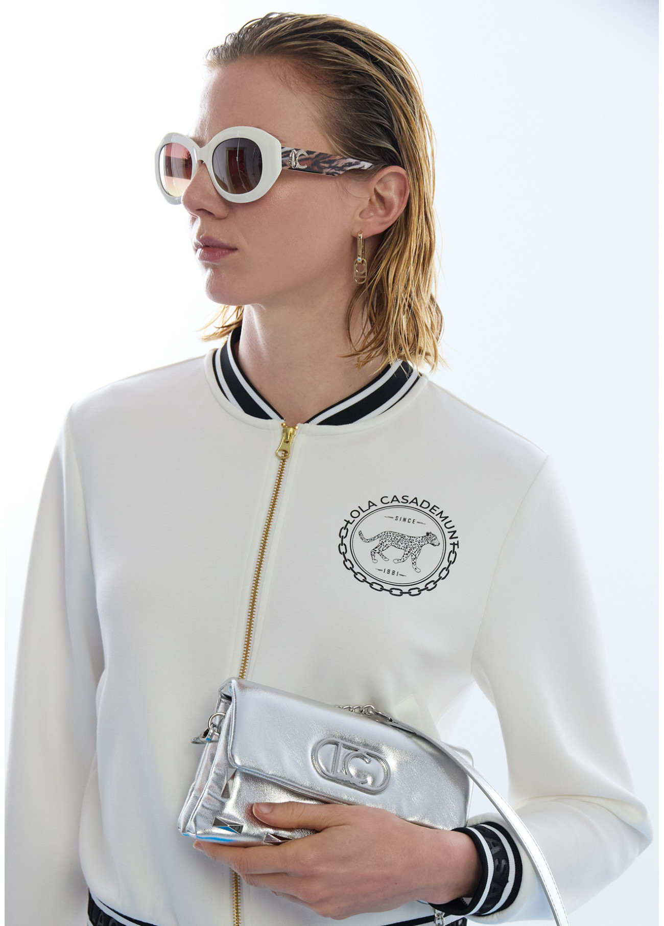 Bomber de tejido scuba con cinta decorativa y estampado en la espalda. Cierre frontal con cremallera y cuello redondo. Puños y cintura elásticos. Diseño moderno y distintivo ideal para un look casual y contemporáneo. Logotipo de la marca en la parte frontal para un toque exclusivo