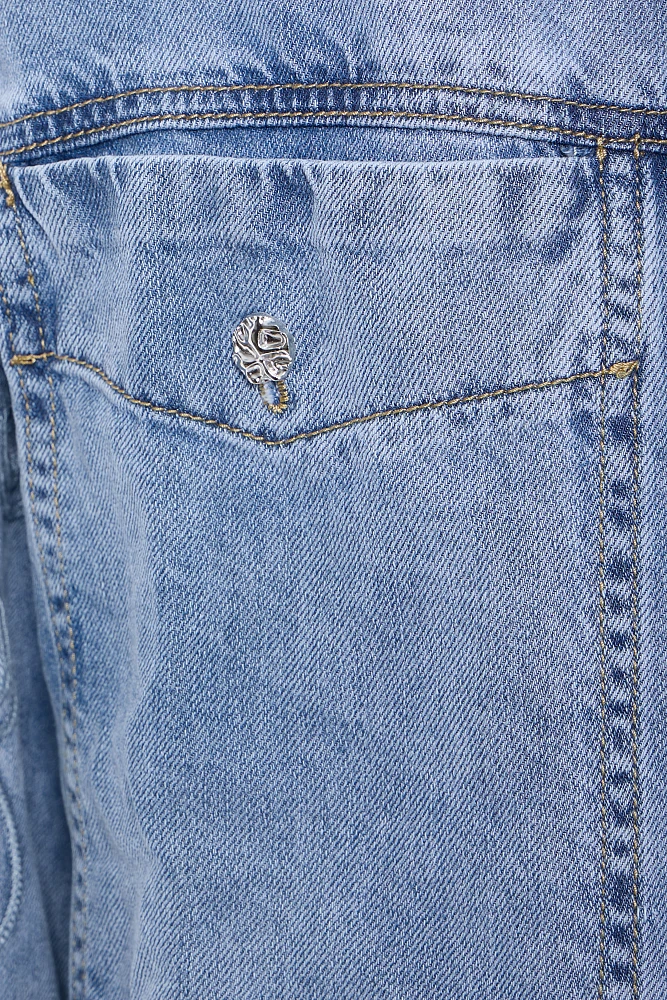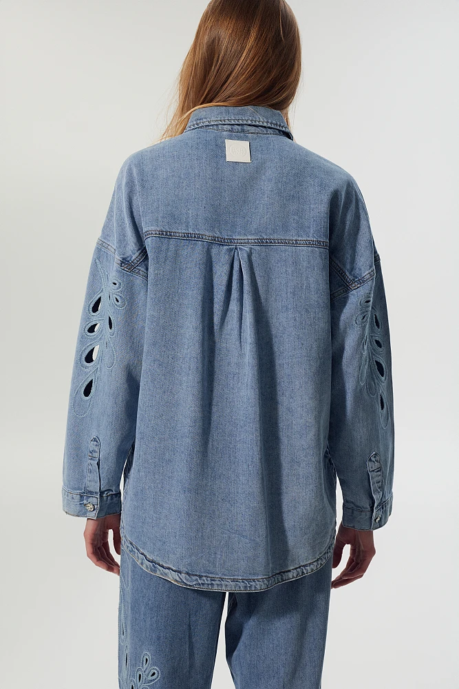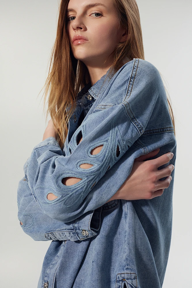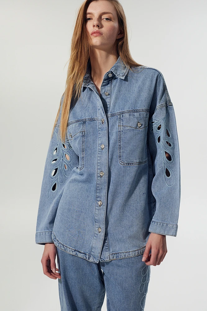 Camisa vaquera, con aberturas en las mangas, bolsillos, cierre con botones joya, con cuello, detalles bordados, oversize