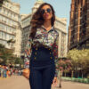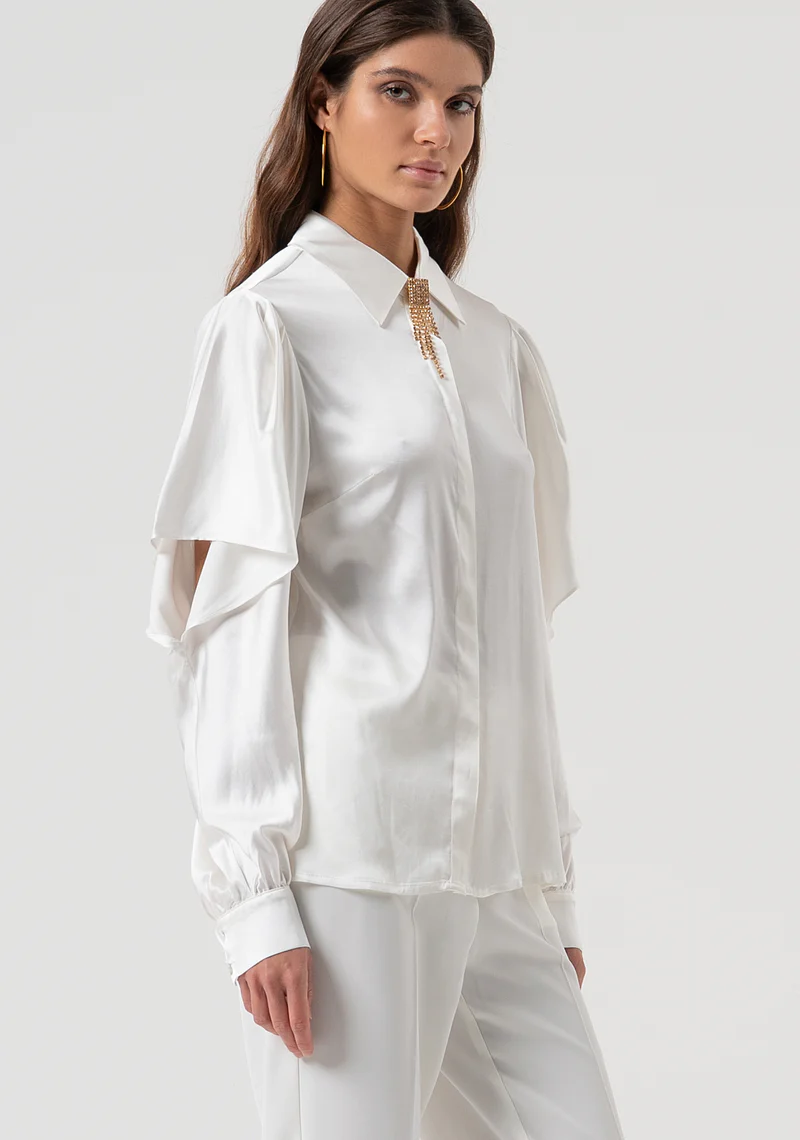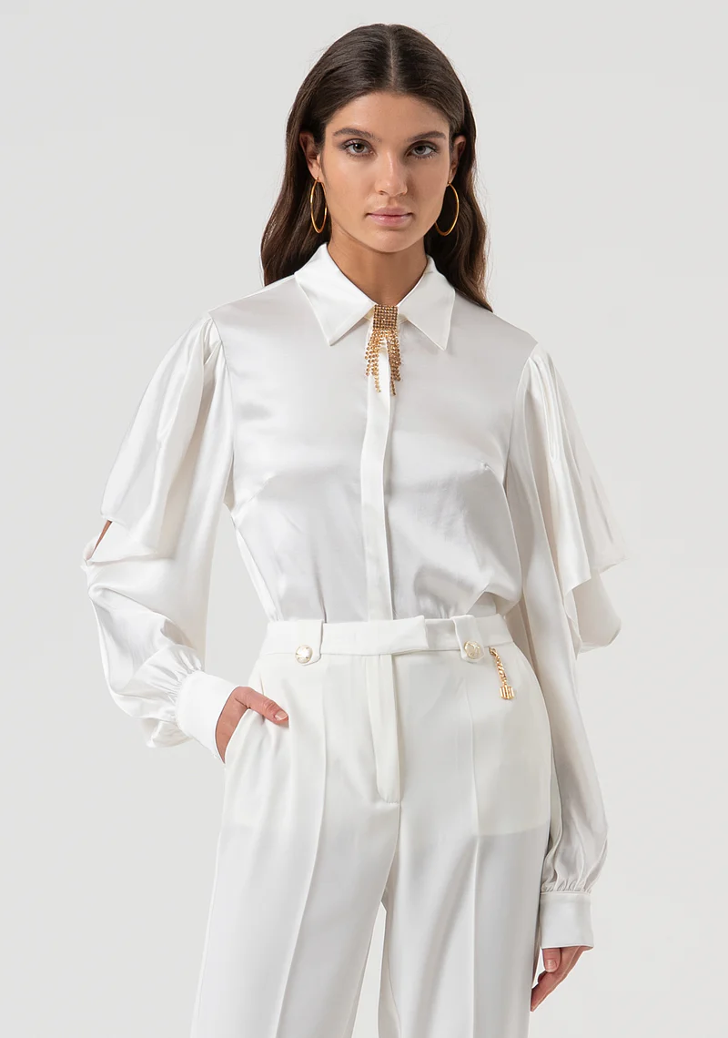 Camisa de corte regular con accesorio joya en el cuello. Cuello de corte clásico y manga larga con volantes