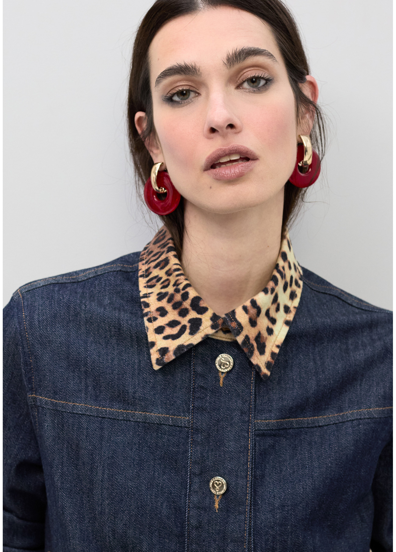 Cazadora corta de denim con detalles en cuello y solapa con estampado leopardo. Diseño estructurado con bolsillos frontales. Botones metálicos grabados y corte recto para un ajuste cómodo. Ideal para un estilo casual con un toque audaz.