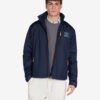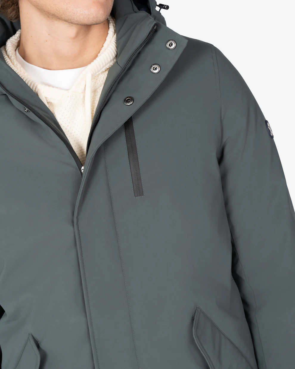 Chaqueta de corte recto y largo medio confeccionada en tejido técnico. Incluye capucha ajustable, cierre de cremallera con solapa cortavientos, bolsillos delanteros con tapeta y bolsillo vertical en el pecho. Presenta logo bordado en la manga y acabados interiores que refuerzan el aislamiento térmico.