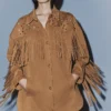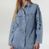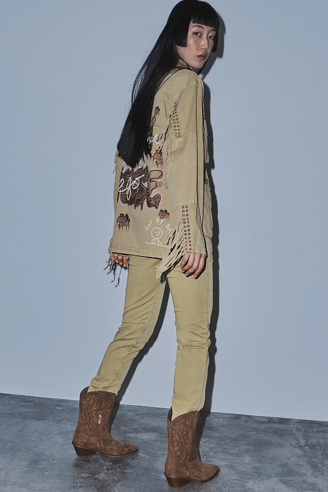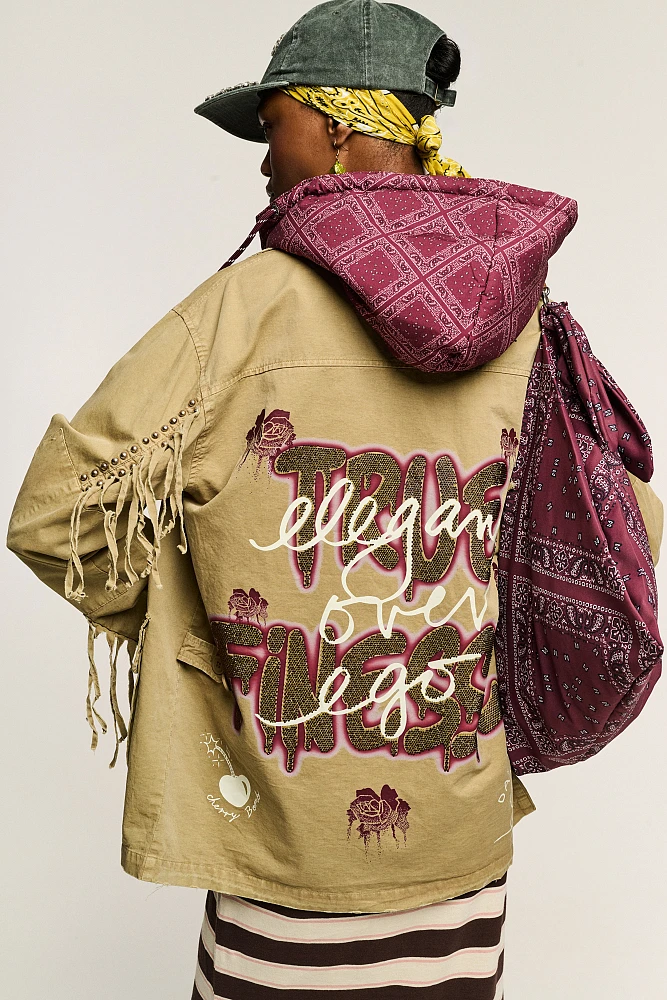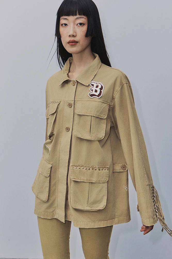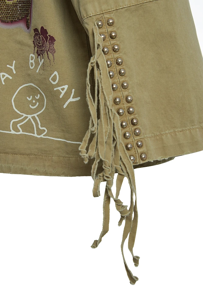 Chaqueta, manga larga, cuello, cierre con botones, detalles con flecos, estampado en la espalda, tachuelas, diseño recto, algodón