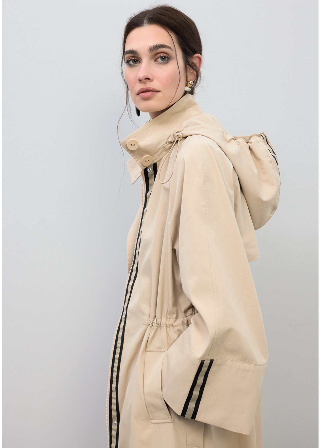 Gabardina parka oversize confeccionada en tejido resistente con rayas decorativas. Presenta cintura ajustable para personalizar el ajuste, capucha funcional y mangas amplias. Cierre de cremallera y botones a presión. Perfecta para un look moderno y casual.