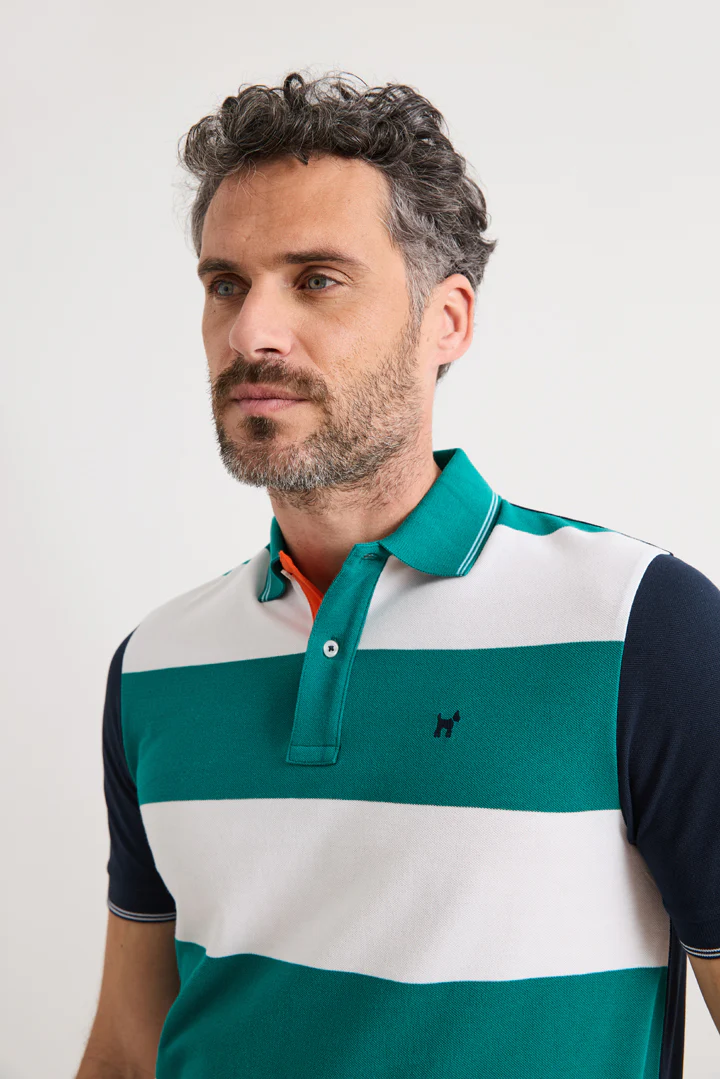 El diseño presenta un cuerpo delantero a rayas, que aporta dinamismo y frescura visual, en contraste con un cuello liso y mangas en tono sólido, realzados por bandas blancas que refuerzan su aire deportivo y contemporáneo. La tapeta interior en color contraste, coordinada con las cubrecosturas internas, suma un acabado elegante incluso cuando el polo se lleva abierto.