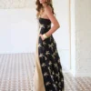Vestido largo, estilo boho, de color blanco roto, entallado, de tirantes. El vestido combina el tejido de crochet con flecos que lleva colgando en la espalda. El escote por la parte delantera es redondo y la espalda la lleva descubierta. En los laterales lleva una abertura y el vestido lleva forro hasta aproximadamente la rodilla. Entalla en la parte de la cintura en la que lleva incluido un cinturón de la misma tela que el vestido con la el logo de la marca en dorado. La modelo mide 1.70 y lleva talla S.